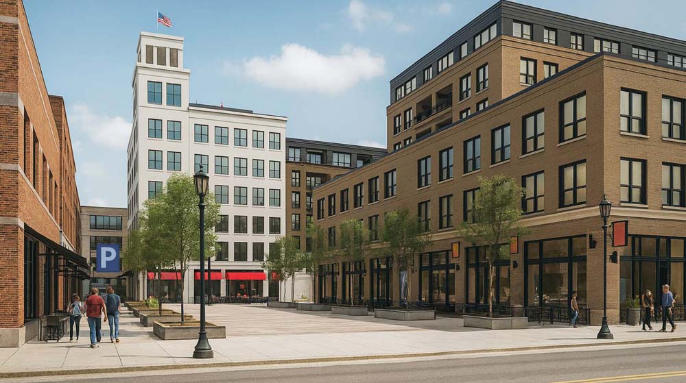 The current plan approved by the Planning Commission was forwarded without consulting nearby neighborhoods about major changes from earlier versions that had community backing. The enhanced plan advanced by BUILD:PUBLIC includes equitable features like a public plaza, front stoops, and ground-floor shops.